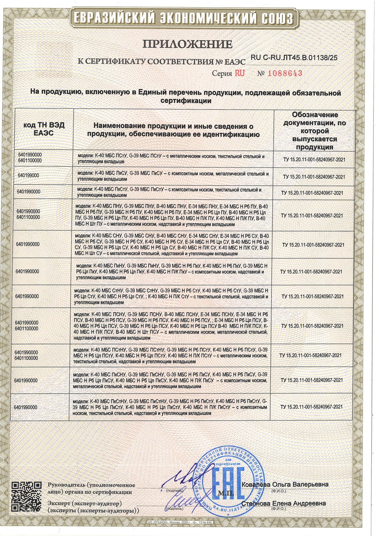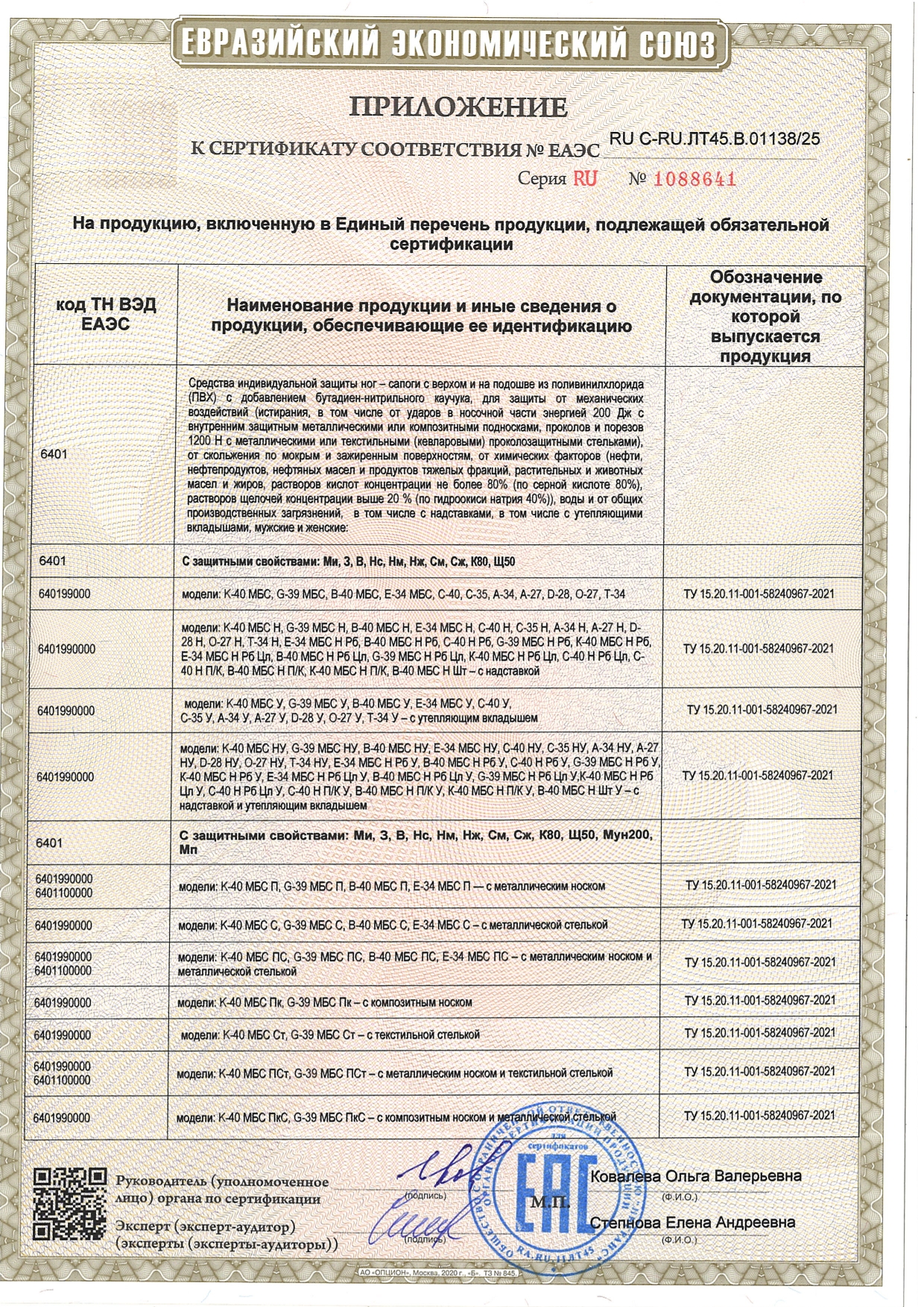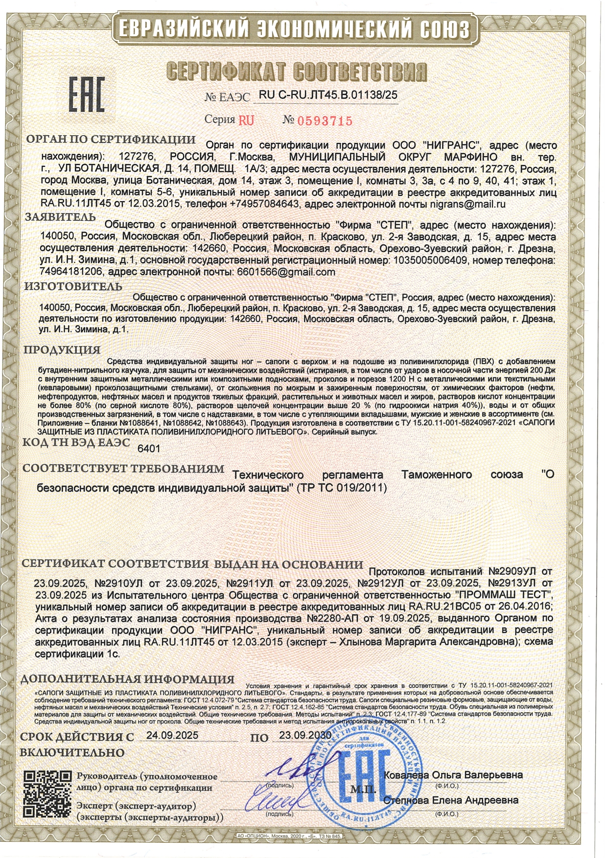 - Сертификат соответствия. Сапоги защитные из ПВХ. ЕАЭС RU С-RU.ЛТ45.В.01138/25 - страница 1, ЕАЭС RU С-RU.ЛТ45.В.01138/25 - страница 2, ЕАЭС RU С-RU.ЛТ45.В.01138/25 - страница 3, ЕАЭС RU С-RU.ЛТ45.В.01138/25 - страница 4; — от химических факторов, производственных загрязнений, механических воздействий, воды, скольжений по зажиренным поверхностям (Сапоги пвх, полукомбинезоны, сапоги рыбацкие)